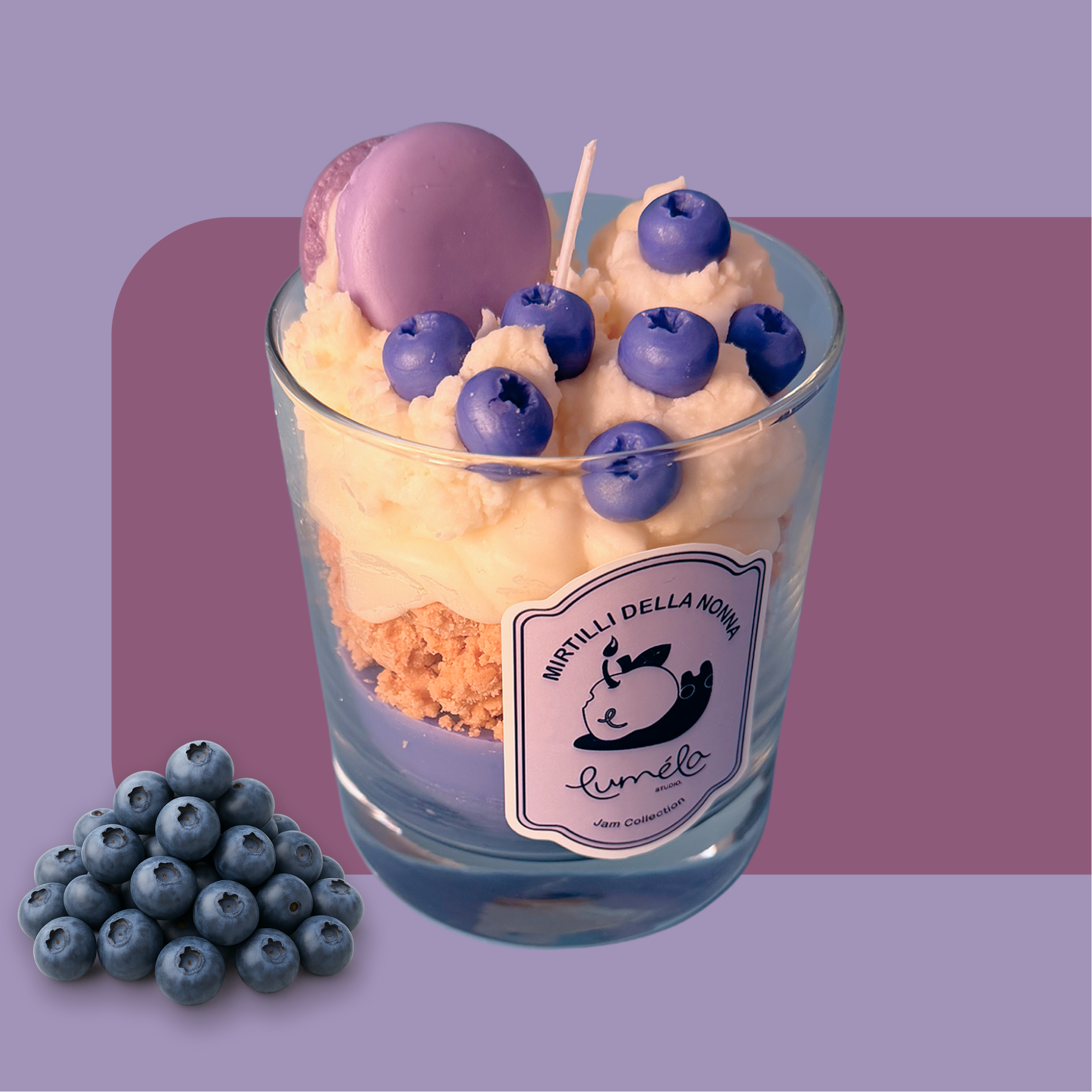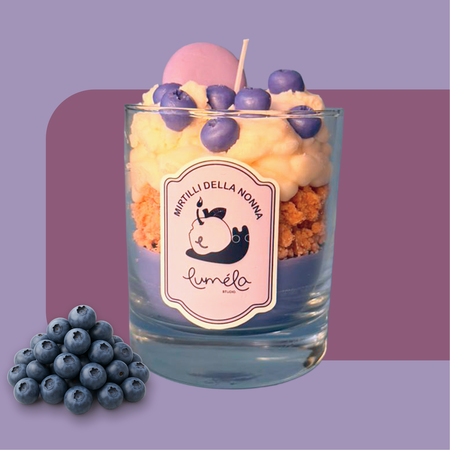 Un dolce ricordo d’infanzia racchiuso in un bicchiere: Mirtilli della Nonna è una candela artigianale in cera di soia naturale, ispirata ai profumi delle torte appena sfornate e alle merende di una volta.